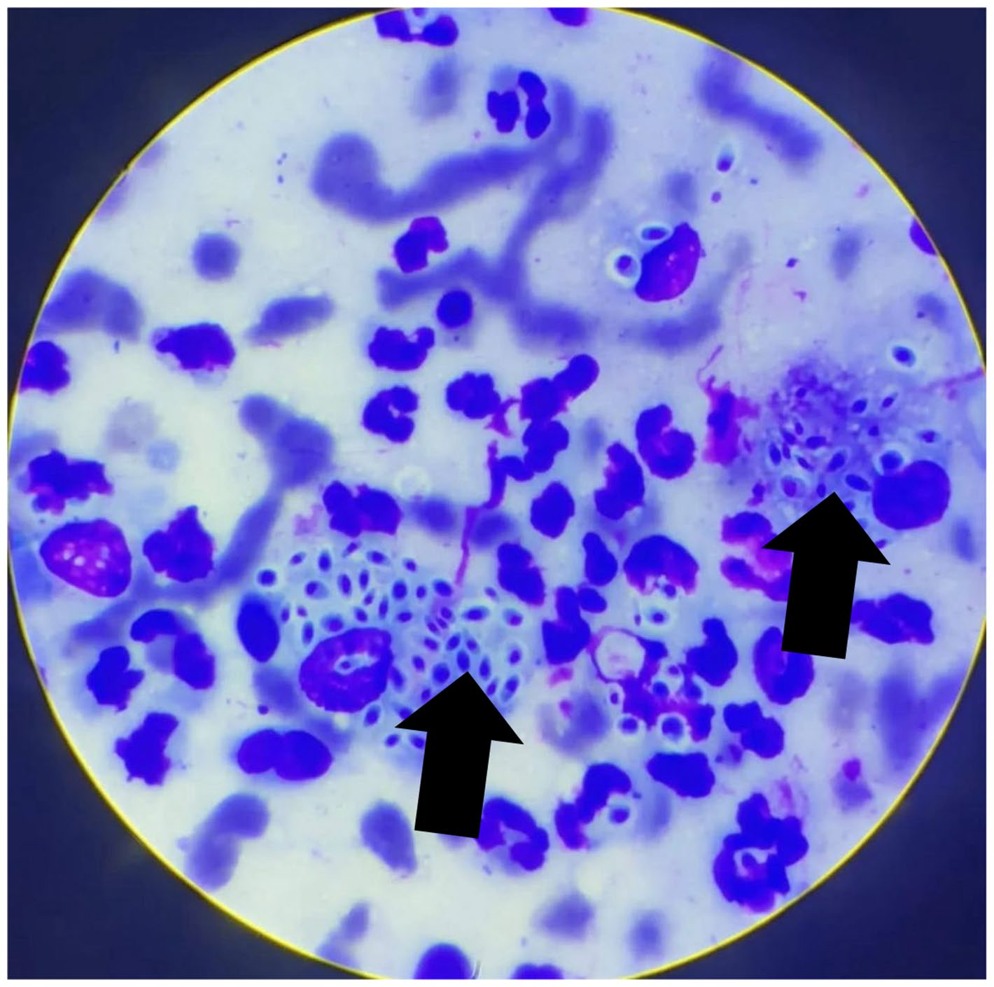 图3. 结膜细针穿刺样本细胞学图像。可见明显的脓性肉芽肿性炎性浸润,由大量变性中性粒细胞及巨噬细胞组成。可见圆形、卵圆形至梭形(“雪茄样”)酵母样结构,周围绕以薄层透明晕,中心呈嗜碱性,符合孢子丝菌(箭头)。组织结构未保存,符合脱落物特征。