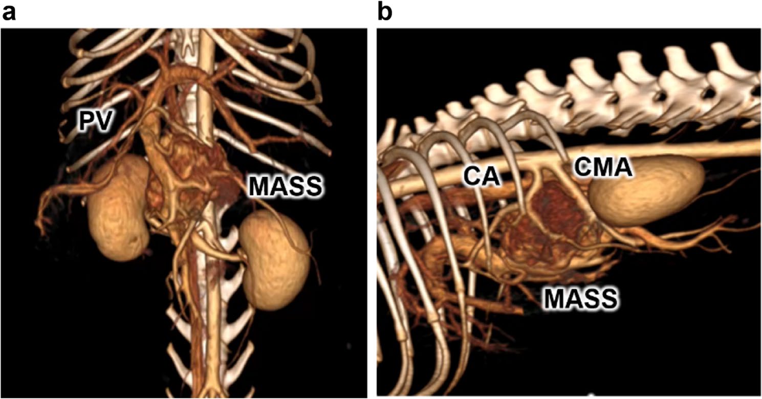 该病对放化疗均不敏感,完整切除是获得长期存活的唯一手段。然而腹膜后PGL常包绕腹主动脉三大干支——腹腔动脉(CA)、肠系膜前动脉(CMA)及门静脉(PV),术中易引发大出血或术后脏器缺血,故外科报道极少,犬领域更缺安全共识。
