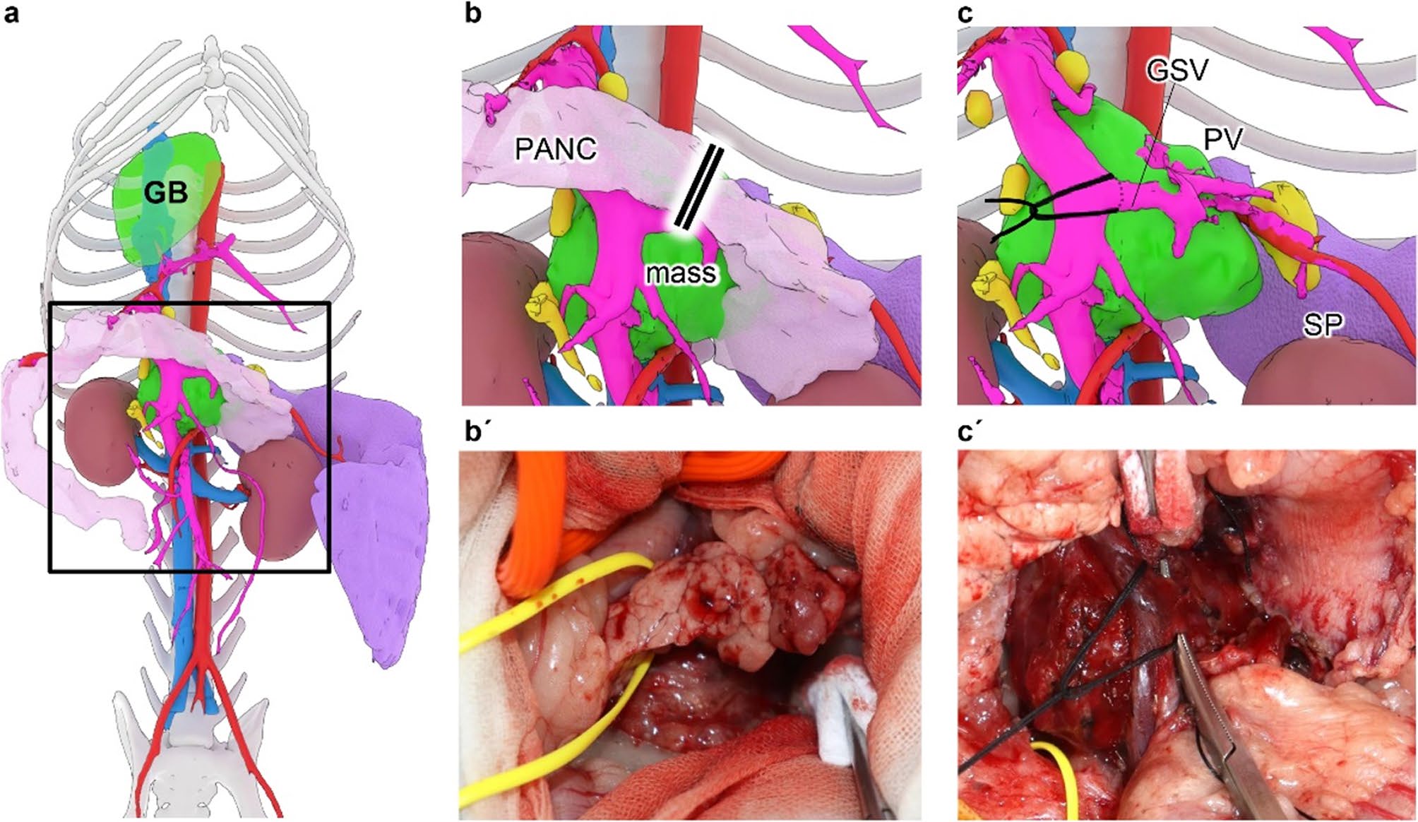 图2. CT图像三维重建。a. 腹部全景,显示肿块与周围脏器的相对位置。b. 胰腺左叶切断。b’. 与图2b对应的术中实拍照片。c. 汇入门静脉主干的胃脾静脉被结扎。c’. 与图2c对应的术中实拍照片。GSV:胃脾静脉;PV:门静脉;SP:脾脏;PANC:胰腺;GB:胆囊。