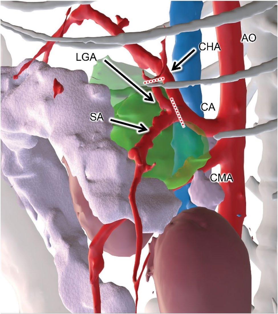图3. 术前CT三维重建。AO:主动脉;CA:腹腔动脉;CHA:肝总动脉;CMA:肠系膜前动脉;LGA:胃左动脉;SA:脾动脉;红色虚线:结扎部位。