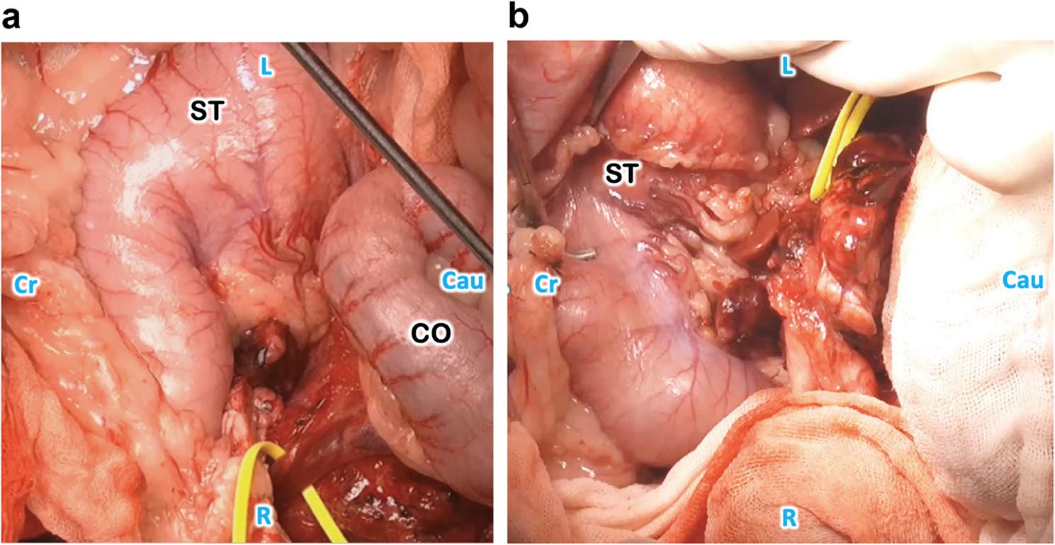 图4. 胃壁血流变化。a. 分离左胃动脉和左脾动脉前。b. 分离左胃动脉和左脾动脉后。CO:结肠,PV:门静脉,ST:胃。
