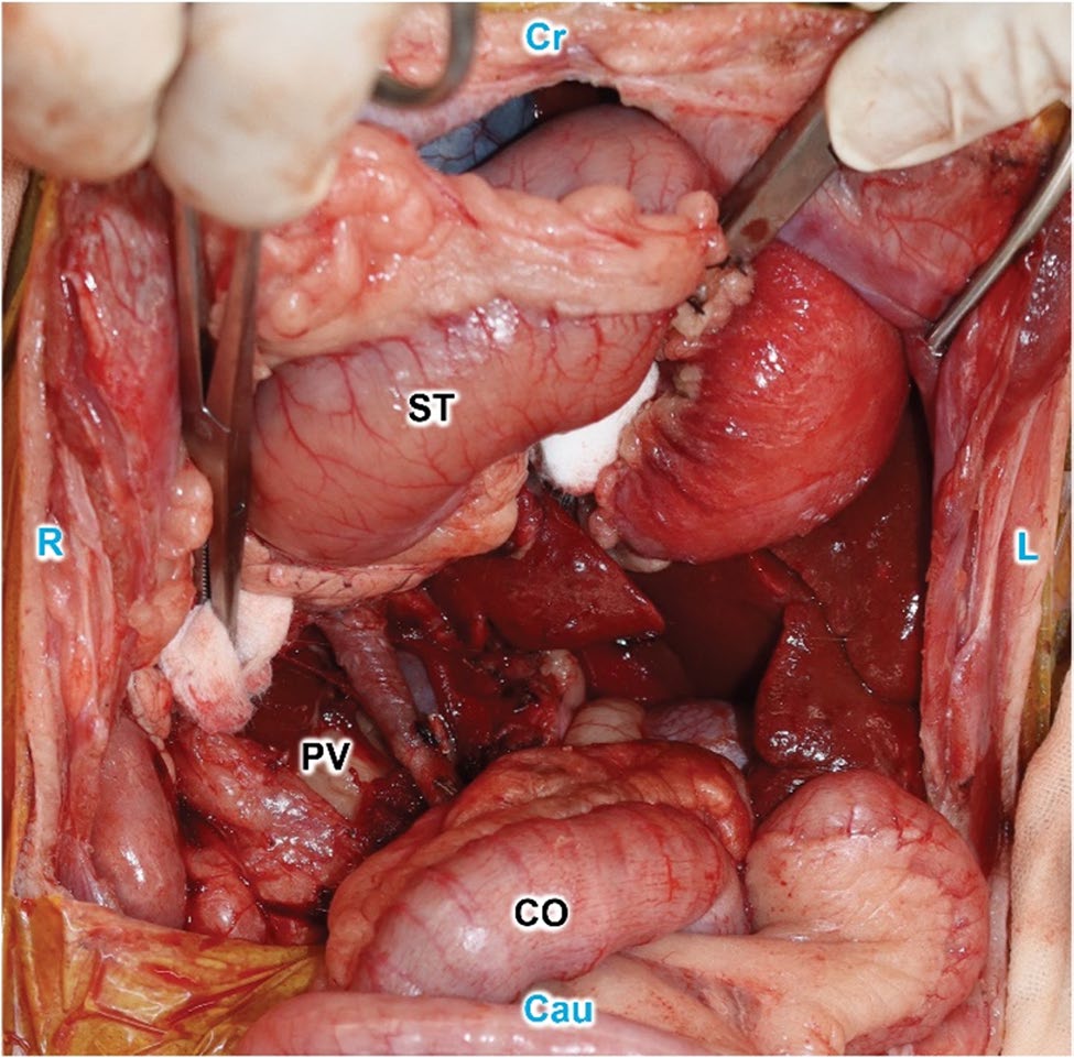 图5. 肿块切除后的腹腔大体观。CO:结肠,PV:门静脉,ST:胃。
