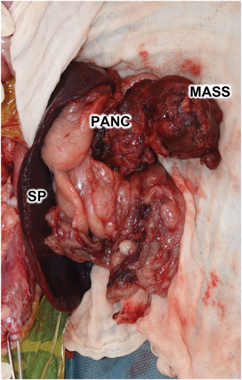 图6. 切除肿块的大体观。PANC:胰腺,SP:脾脏。