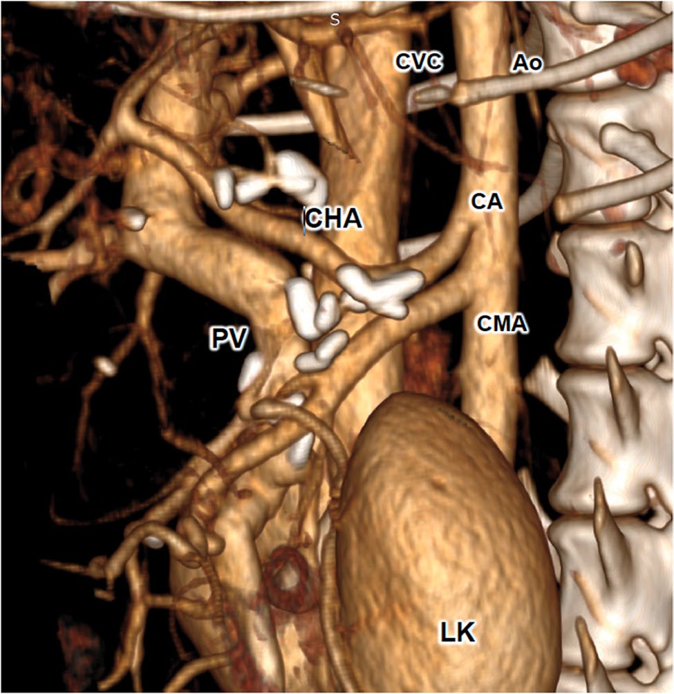 图7. 术后CT重建三维图像左侧观:腹腔动脉轴中,肝动脉得以选择性保留。AO:主动脉;CA:腹腔动脉;CHA:肝总动脉;CMA:肠系膜前动脉;LK:左肾;PV:门静脉;CVC:后腔静脉。