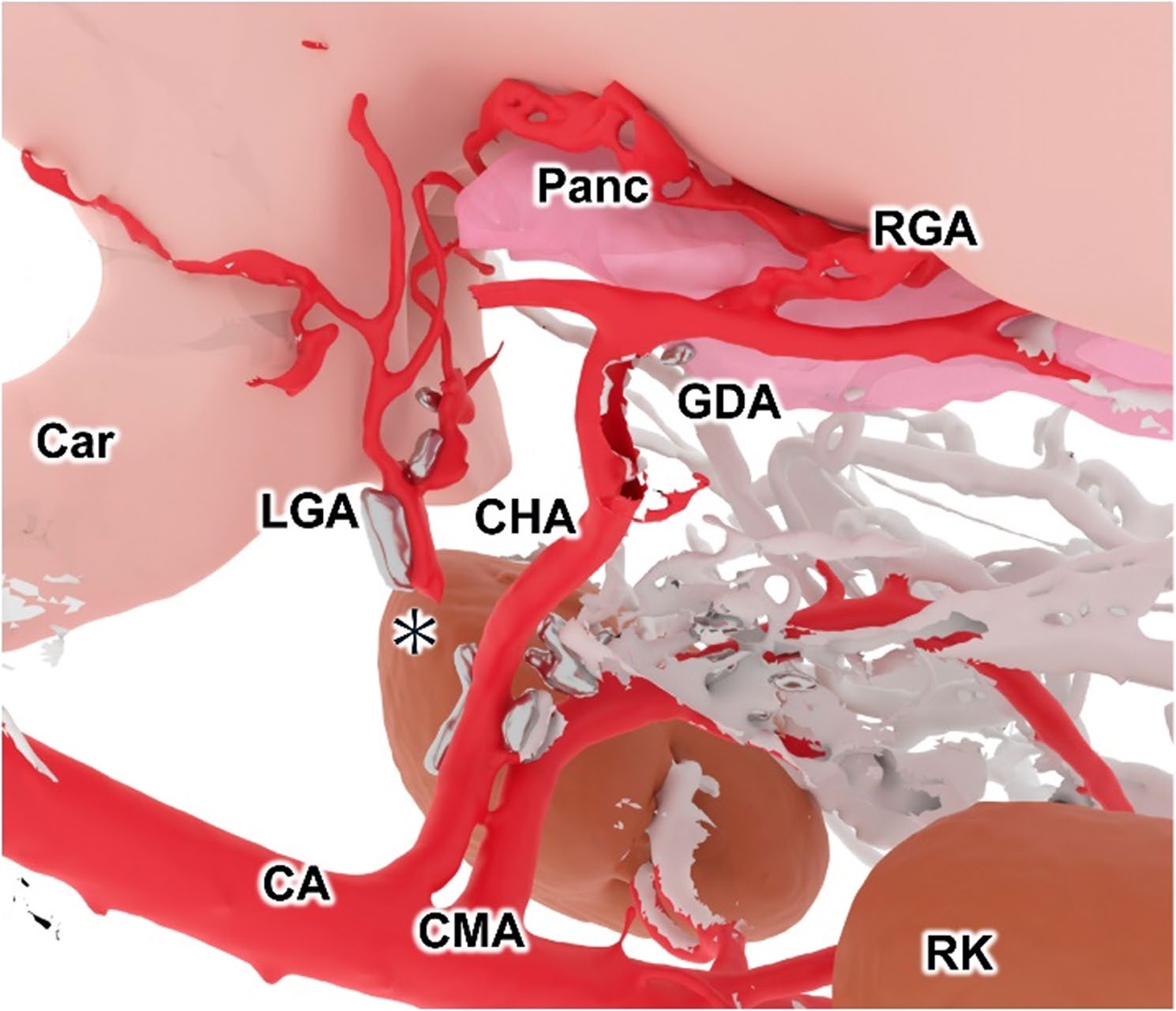 图8. 术后CT重建胃小弯侧三维图像。AO:主动脉;CA:腹腔动脉;Car:贲门;CHA:肝总动脉;CMA:肠系膜前动脉;GDA:胃十二指肠动脉;LGA:胃左动脉;RK:右肾;PANC:胰腺。