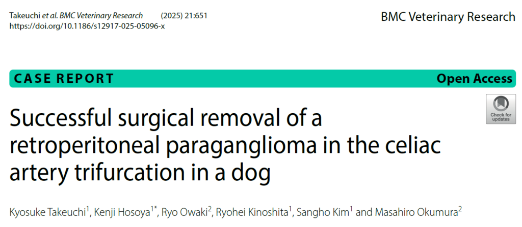 文献来源:Takeuchi K, Hosoya K, Owaki R, Kinoshita R, Kim S, Okumura M. Successful surgical removal of a retroperitoneal paraganglioma in the celiac artery trifurcation in a dog. BMC Vet Res. 2025 Nov 7;21(1):651.