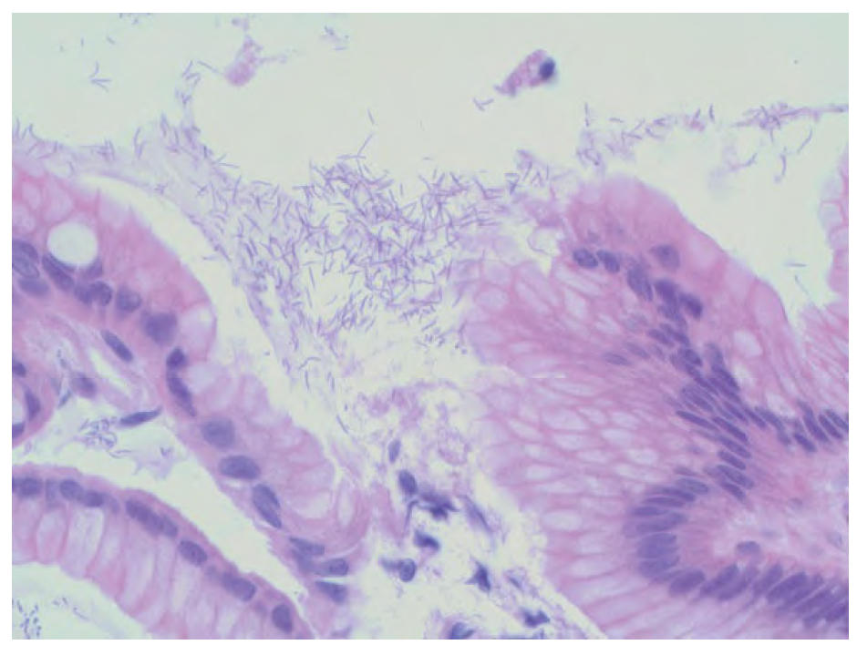 - 检出螺杆菌样微生物需用Warthin-Starry或改良Steiner染色;常规H&E(图1)可能发现较大菌体,小型菌易漏诊。