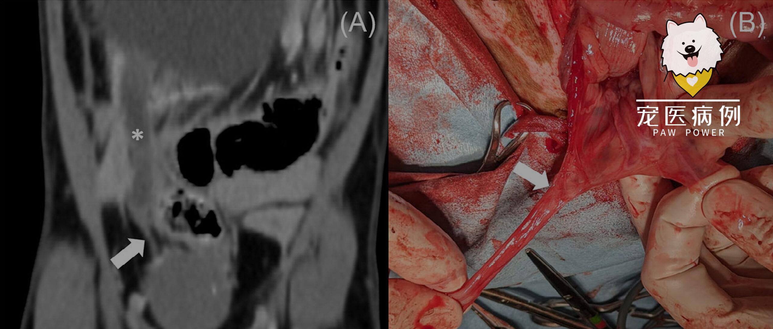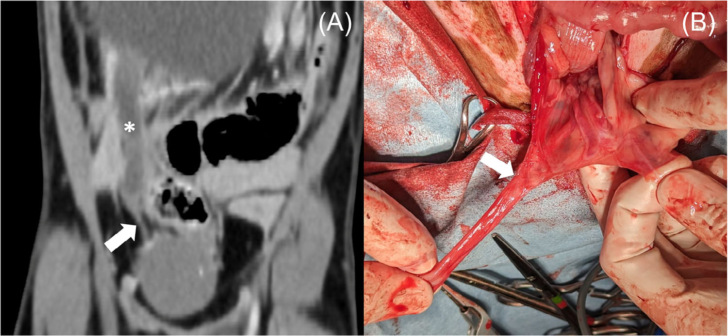 图4. 右输尿管狭窄的背侧CT图像及对应术中照片。(A)右输尿管积水(*)及输尿管膀胱连接部头侧局灶性狭窄(白箭头),管壁无异常。(B)术中见右输尿管突然狭窄处(白箭头)。