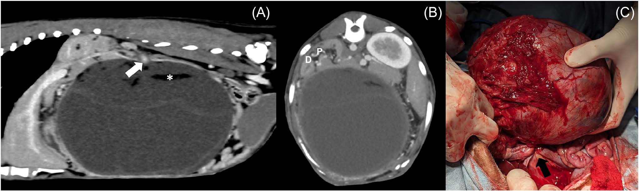 图1.(A)矢状面CT图像示囊性液性肿块,推测为极度增大的右肾伴重度肾积水;扩张肾盂内可见脂肪密度小滴(*)。肿块背侧高密度区为“漩涡征”中心(白箭头)。注意因占位效应肝叶向颅侧移位。(B)横断面CT图像示十二指肠(D)及胰腺(P)因占位效应向背右侧移位。(C)术中见右肾显著增大,扭曲的血管蒂暴露(黑箭头)。