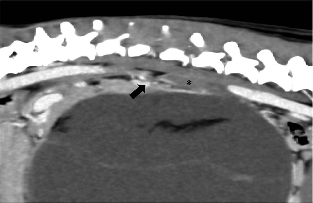 图3. 增强后矢状厚层MIP示下腔静脉于“漩涡”水平塌陷(黑箭头),肾前段管腔内见大血栓(*)。