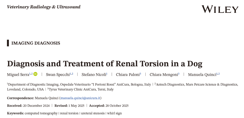 文献来源:Serra M, Specchi S, Nicoli S, Paloni C, Mengoni C, Quinci M. Diagnosis and Treatment of Renal Torsion in a Dog. Vet Radiol Ultrasound. 2025 Nov;66(6):e70104.