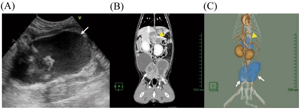 图1. 超声及增强CT影像。(A)第1天髂内淋巴结的腹部超声图像。(B)第2天增强冠状位CT图像及(C)三维CT重建。黄色箭头示肝淋巴结,白色箭头示髂内淋巴结。3D图像中淋巴结以蓝色显示。