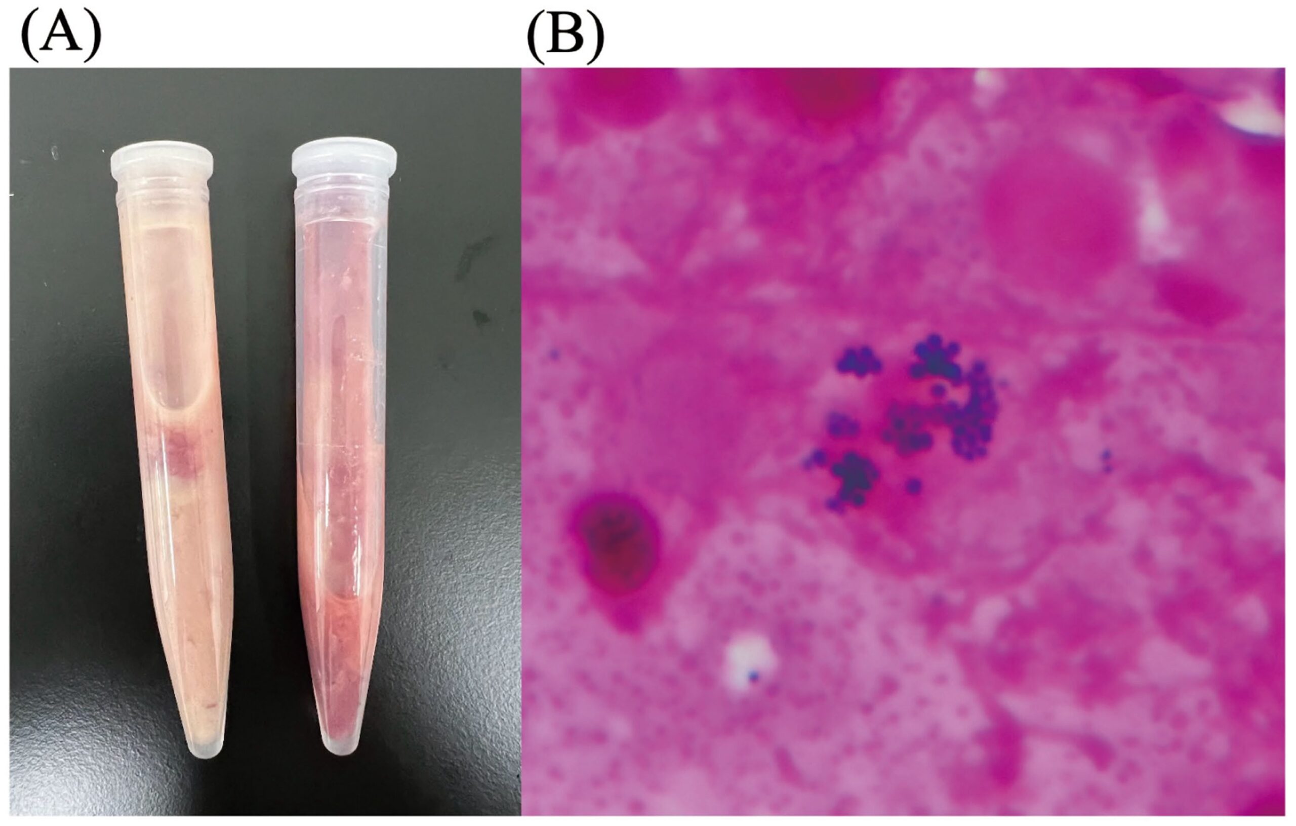 图2. 腹腔淋巴结脓肿穿刺液及革兰染色结果。(A)自腹腔淋巴结脓肿抽出的乳白色液体。(B)穿刺液革兰染色涂片可见革兰阳性球菌。
