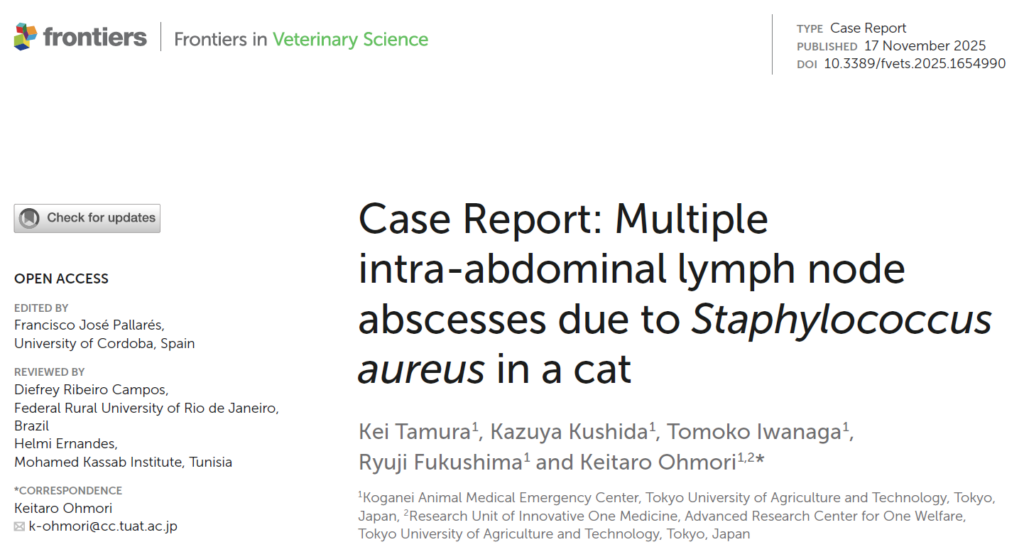 文献来源:Tamura K, Kushida K, Iwanaga T, Fukushima R, Ohmori K. Case Report: Multiple intra-abdominal lymph node abscesses due to Staphylococcus aureus in a cat. Front Vet Sci. 2025 Nov 17;12:1654990.