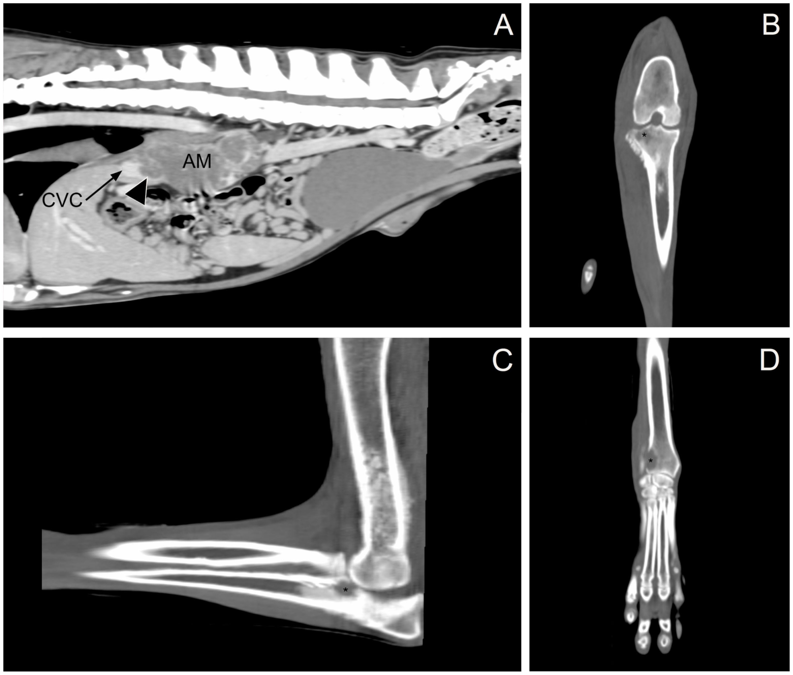 图1. CT。(A)矢状位增强图像示右肾上腺肿块(AM)侵及后腔静脉(CVC,黑箭头;侵犯处,三角)。(B)背侧平扫图像示右胫骨近端溶骨性破坏(*)。(C)矢状位平扫图像示右尺骨近端溶骨性破坏(*)。(D)背侧平扫图像示右桡骨远端溶骨性破坏(*)。