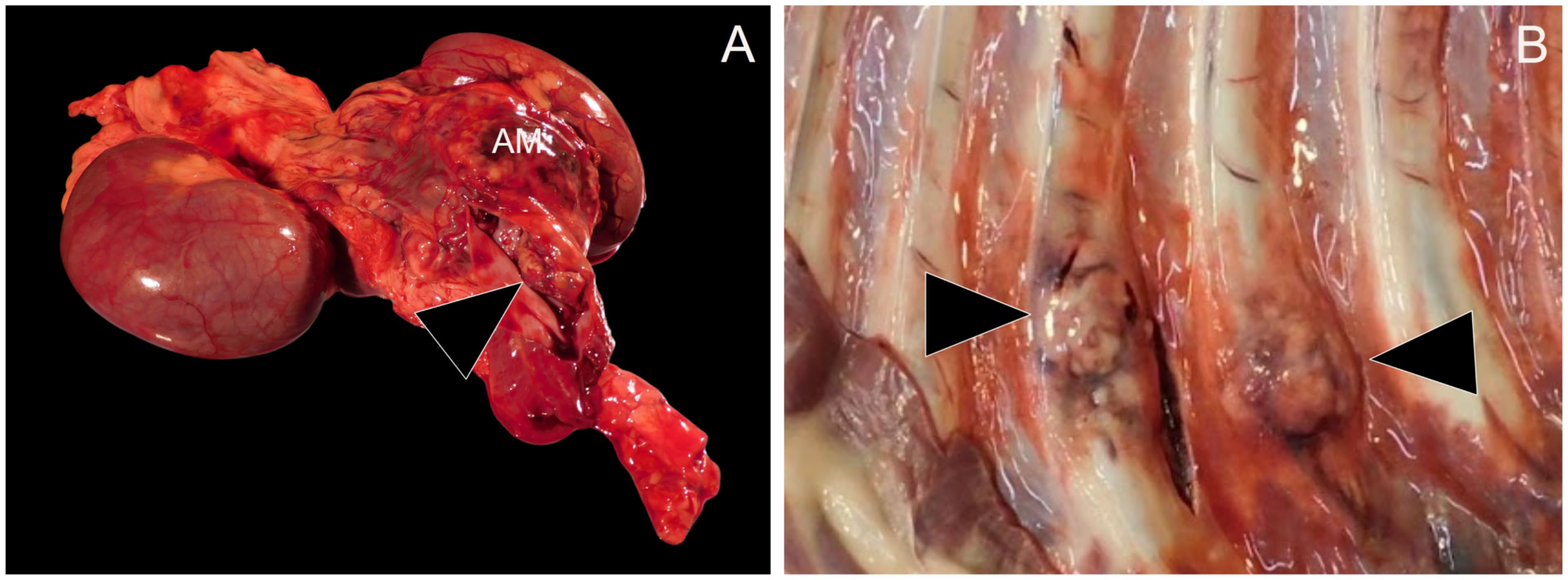 图2. 尸检所见。(A)右肾上腺被一13×7×6 cm黄-褐-红色、坚实、多结节肿块(AM)取代,肿块突入后腔静脉管腔(箭头)。(B)肋软骨交界处可见多个直径1–3 cm、质地坚实至硬、斑驳白-褐-红色结节(箭头)。