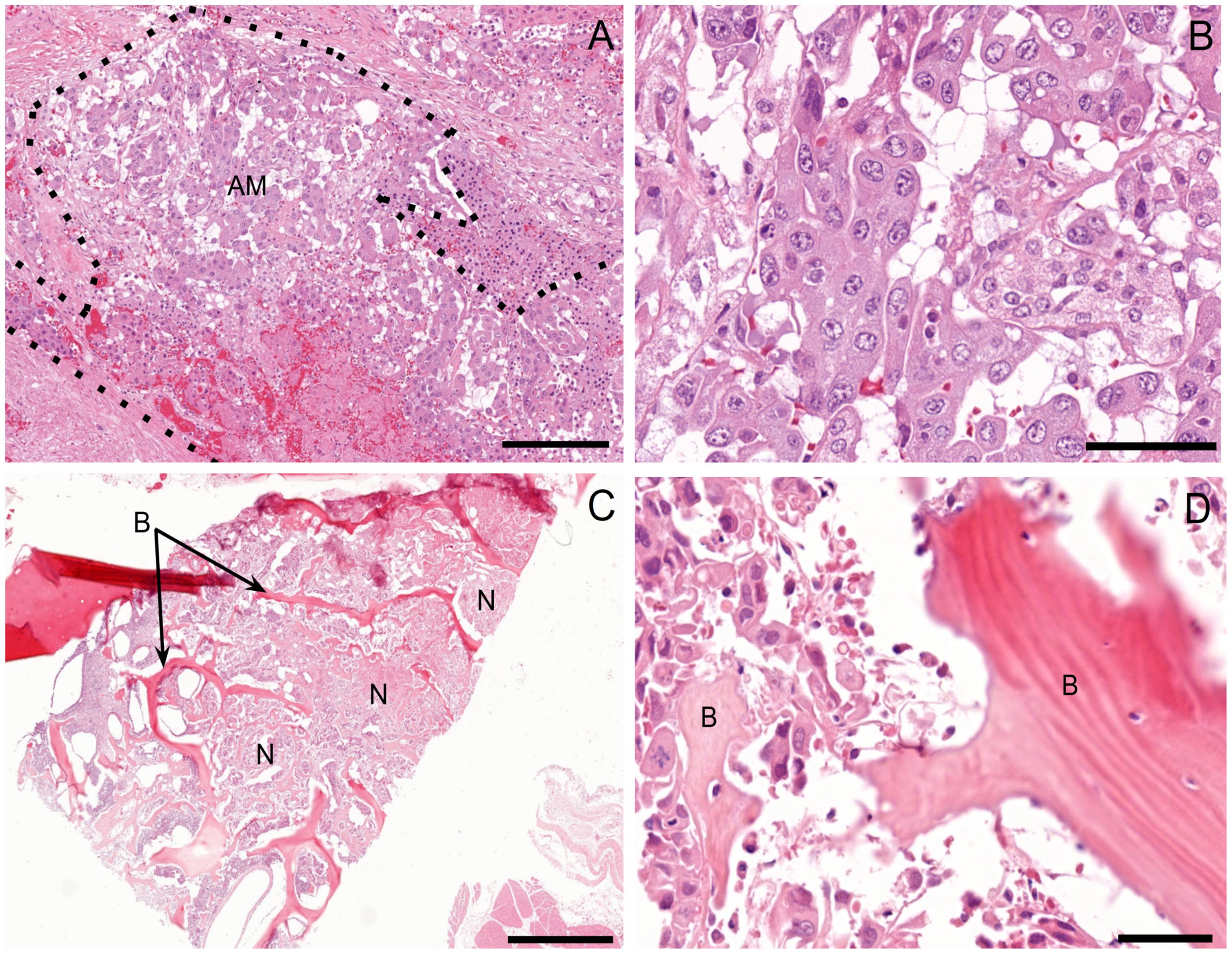图3. 组织病理学检查。(A)右肾上腺:正常结构被一无包膜、界限不清的肿瘤(AM,虚线勾勒)取代。(B)瘤细胞多边形至立方形,呈巢团、索状沿纤细纤维血管间质排列;胞质中等量、嗜酸、细颗粒状,偶见空泡;核大,卵圆至不规则,染色质凝聚,可见1–3个中小核仁。(C)右桡腕骨(B):大片致密细胞肿瘤(N)浸润、取代并包绕大小不一的原有编织骨岛。(D)瘤细胞形态与右肾上腺肿瘤相似,并与原有骨(B)交织。