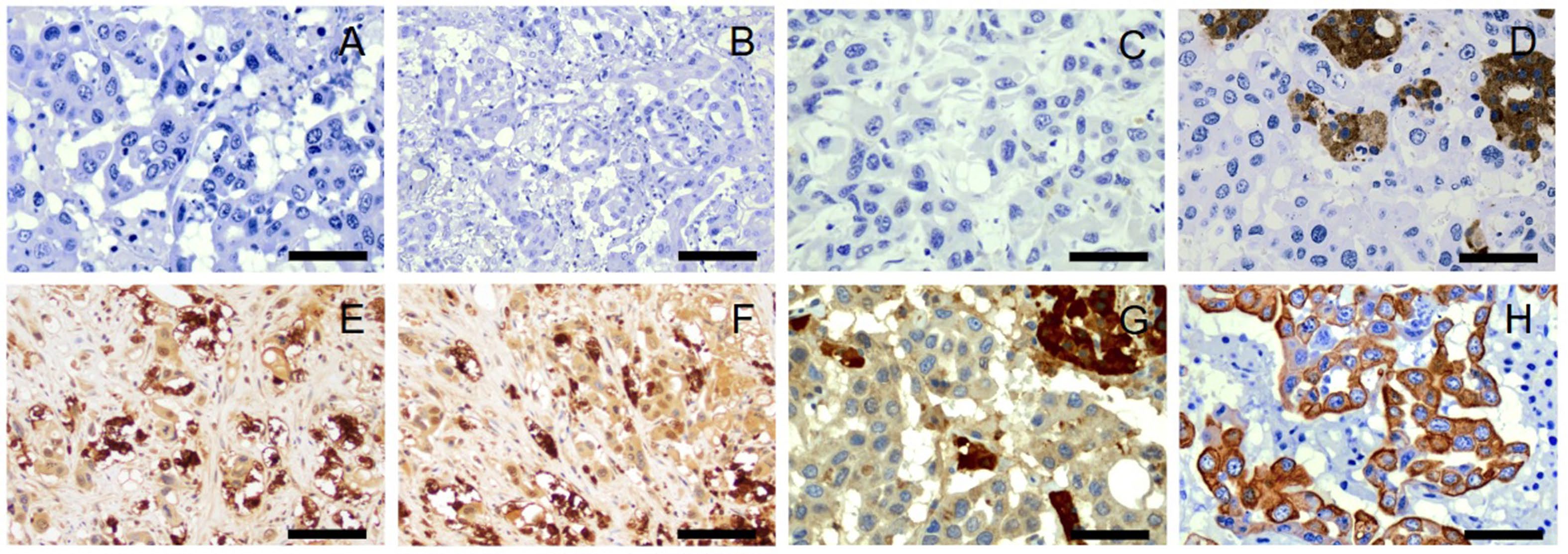 图4. 右肾上腺免疫组化。肿瘤细胞对酪氨酸羟化酶(A)、甲状腺转录因子-1(B)、甲胎蛋白(C)、突触素(D)、β-内啡肽(E)及甲硫氨酸脑啡肽(F)均呈阴性。正常嗜铬细胞突触素强阳性(D)。约80–90%肿瘤细胞嗜铬粒蛋白A呈弱至中度胞质阳性(G),广谱细胞角蛋白呈强胞质、近膜阳性(H)。正常嗜铬细胞嗜铬粒蛋白A强阳性(G)。