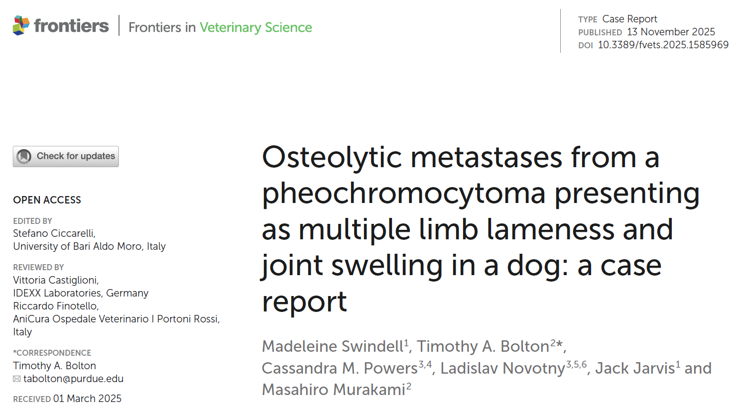 文献来源:Swindell M, Bolton TA, Powers CM, Novotny L, Jarvis J, Murakami M. Osteolytic metastases from a pheochromocytoma presenting as multiple limb lameness and joint swelling in a dog: a case report. Front Vet Sci. 2025 Nov 13;12:1585969.