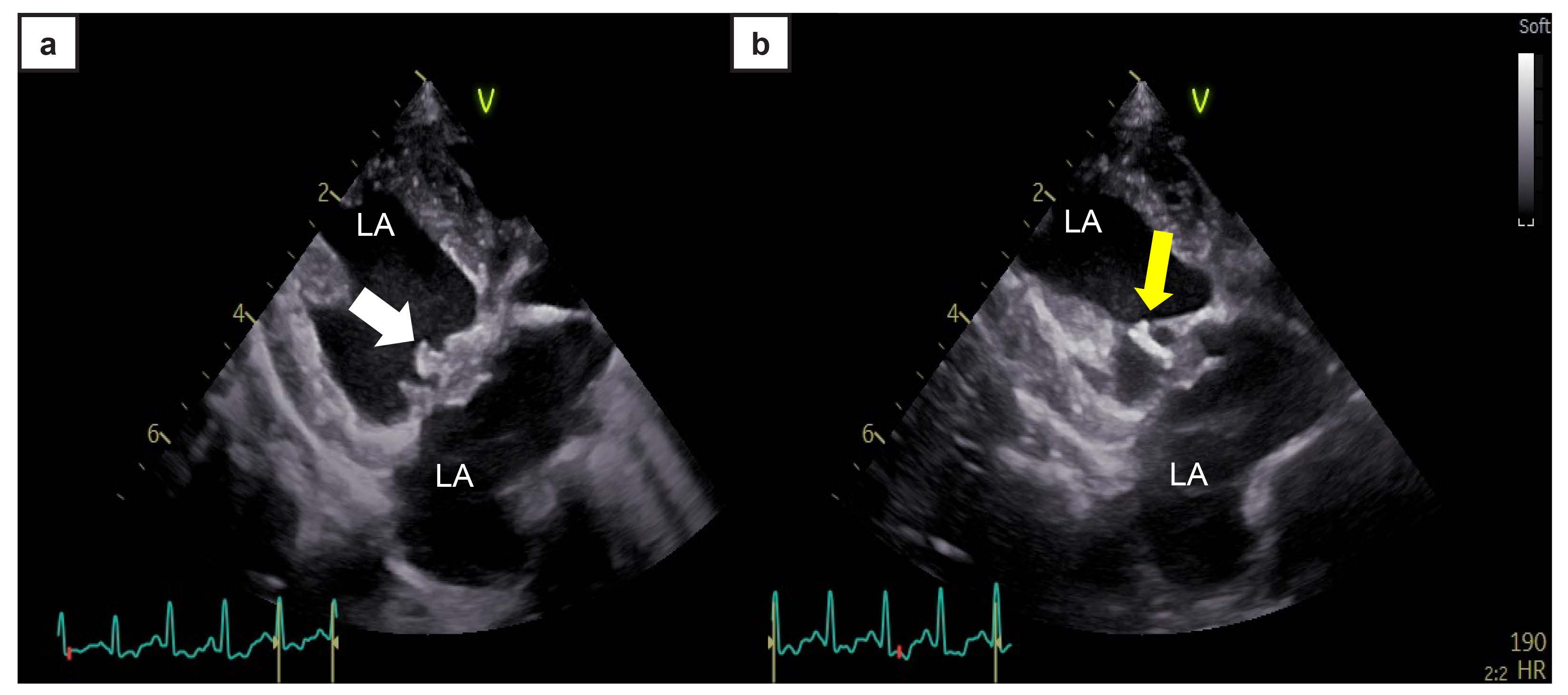 图1. 二维超声心动图(ab)。右侧胸骨旁长轴切面显示二尖瓣下方一高回声结构(白色箭头),腱索回声亦增强(黄色箭头)。LA:左心房,LV:左心室。