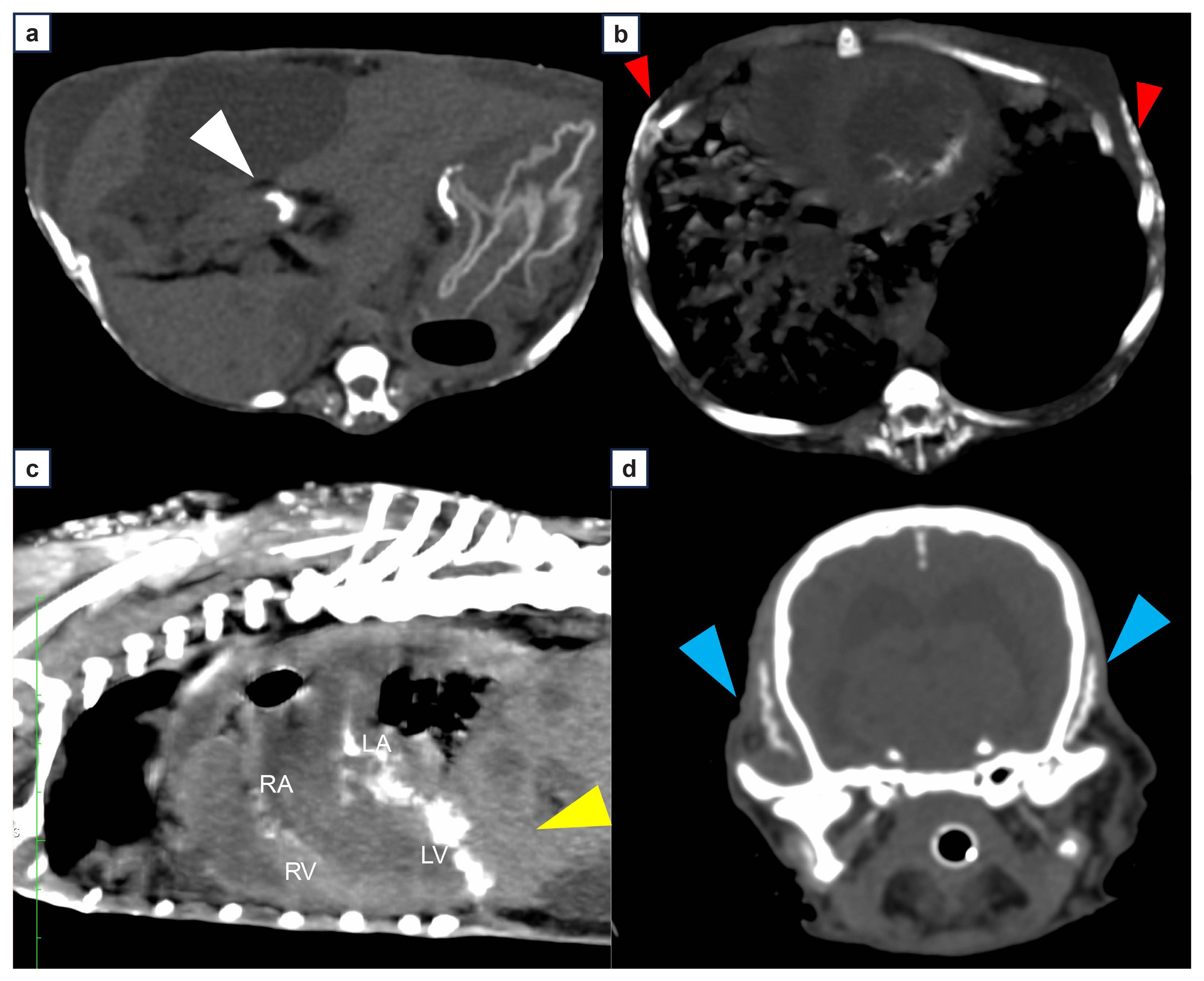 体重3.14 kg,体况评分3/9,伴有严重肌肉萎缩。心率126次/分,节律规整;股动脉搏动及黏膜颜色正常。可见腹围增大、皮肤变薄及局部皮肤硬化。听诊左心尖部4/6级收缩期杂音。