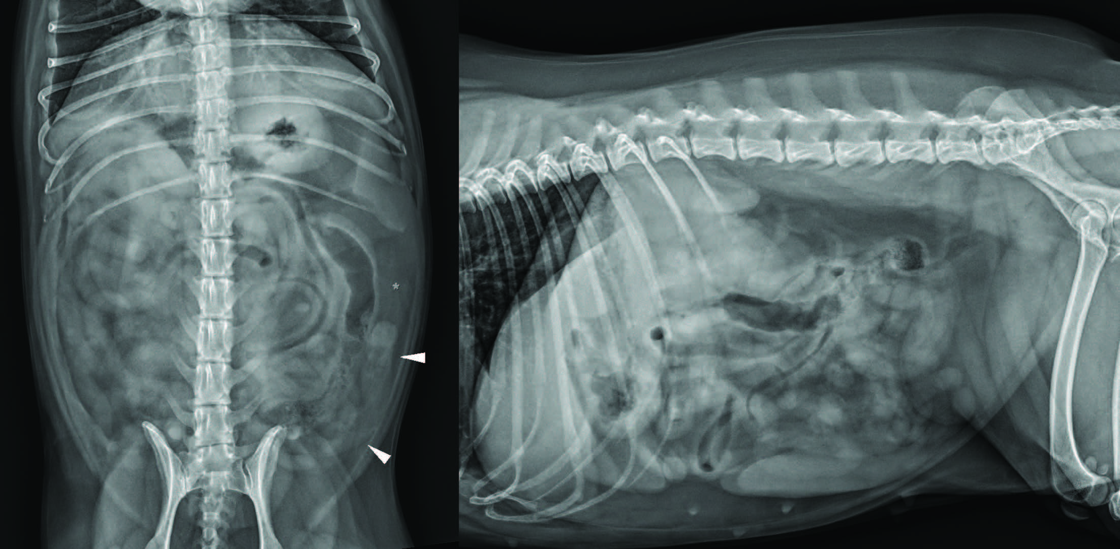 图1. 腹背位(左)及左侧位(右)X线片。可见腹膜左侧尾外侧纵向结构,符合扩张的左侧子宫角(箭头),伴邻近浆膜细节轻度丢失(星号)。右侧卵巢区域未见明显病变。