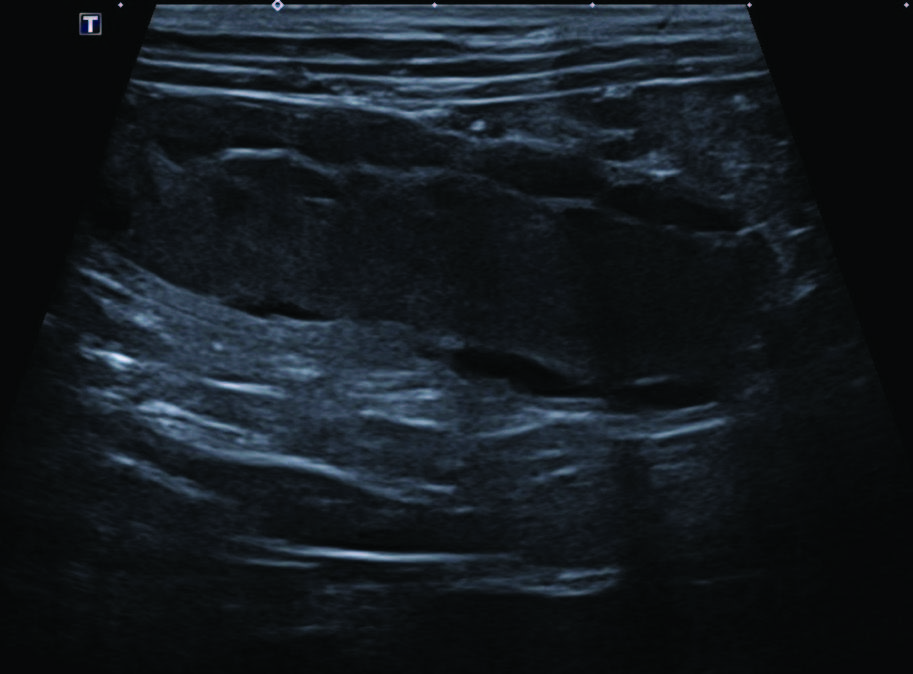 图2. 使用微凸探头B模式,在左侧卧位进行的腹部超声纵切面检查。图像左侧为头侧。右侧子宫角中度扩张,腔内为不移动的高回声内容物,壁不规则,并可见多个壁内卵圆形无回声病灶。