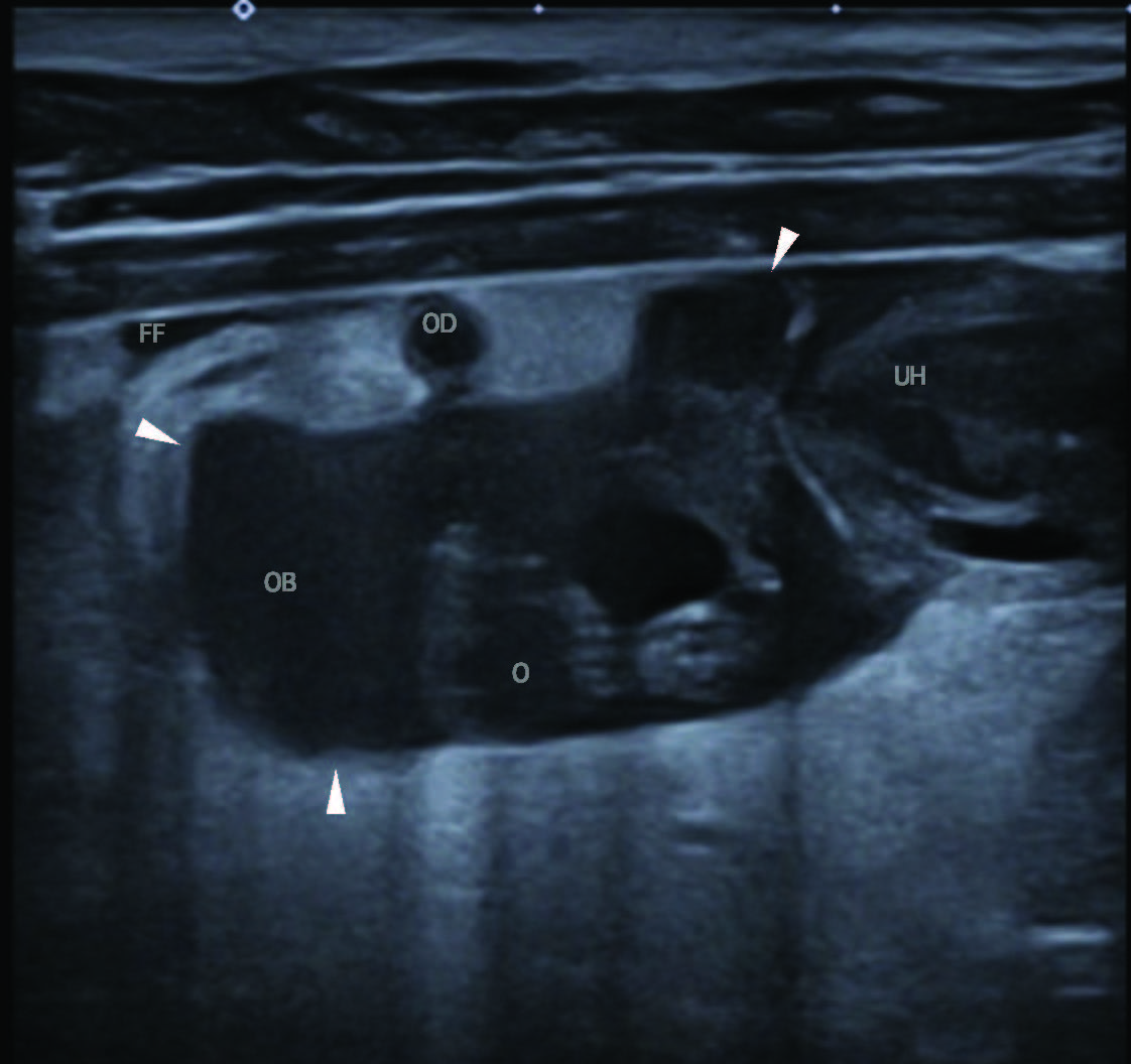图3. 使用高频线阵探头B模式,在左侧卧位进行的腹部超声纵切面检查。图像左侧为头侧。右侧子宫角卵巢端(UH);右侧卵巢可见结节性病灶(O),周围环绕一界限清晰、充满液体的病灶,符合右侧卵巢囊(OB;箭头示卵巢囊边界)。该病灶周围腹膜脂肪回声增强,并伴有少量游离液体(FF)。图中横向显示的纤细弯曲管状结构,符合输卵管(OD)。