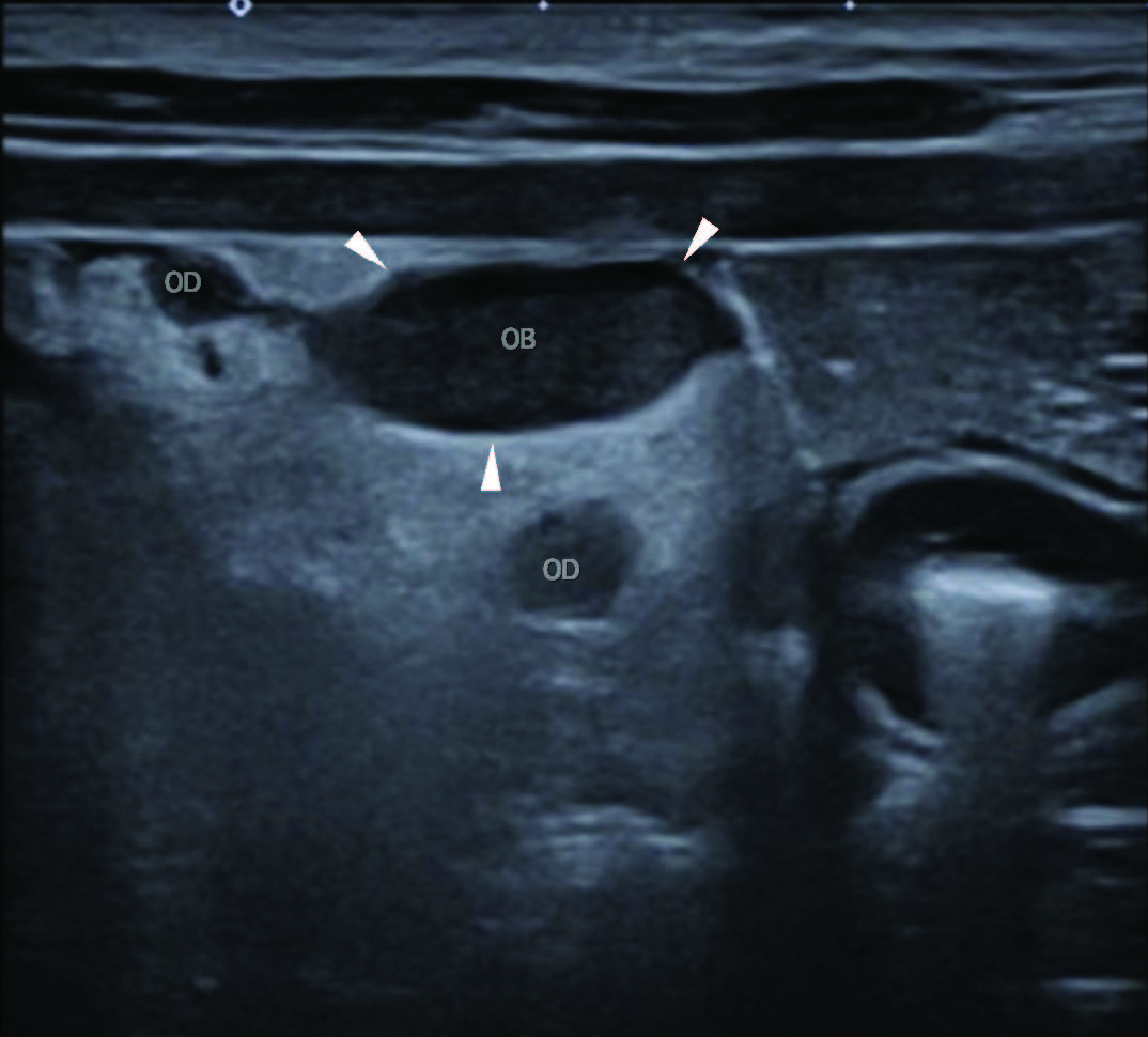图4. 使用高频线阵探头B模式,在左侧卧位进行的腹部超声横断面检查。图像左侧为外侧。注意右侧卵巢囊(OB;箭头示卵巢囊边界),以及部分纤细弯曲的管状结构,符合输卵管(OD;图像中位置最高者靠近卵巢囊,位置最低者邻近子宫角卵巢端)。