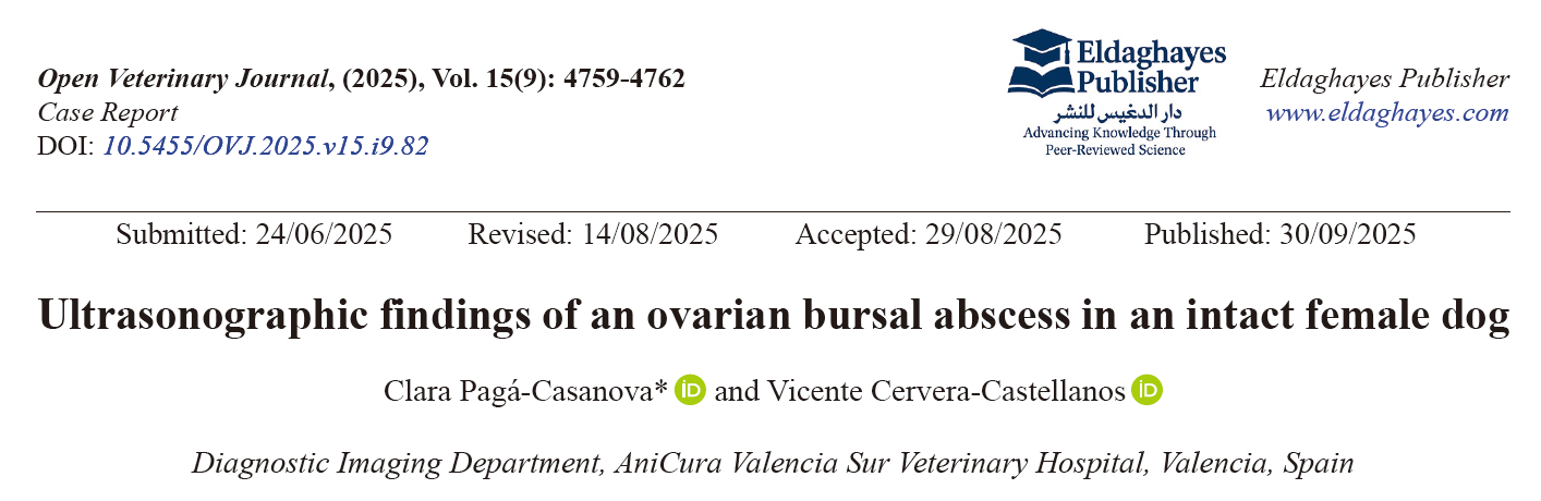 文献来源:Pagá-Casanova C, Cervera-Castellanos V. Ultrasonographic findings of an ovarian bursal abscess in an intact female dog. Open Vet J. 2025 Sep;15(9):4759-4762.