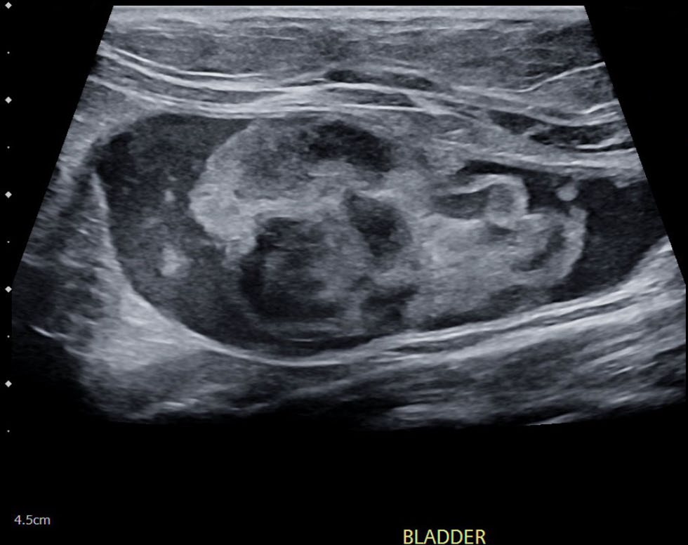 次日晨,红细胞压积降至24%。腹部超声显示膀胱内见一约4×2.2 cm、边界大多清晰但边缘不规则的混合回声大肿块(图1);另见数个2–3 mm、广基至带蒂的高回声小突起附于膀胱壁。