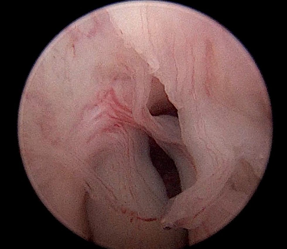 图2. 膀胱镜检查所见:膀胱三角区增生、高度血管化的组织。