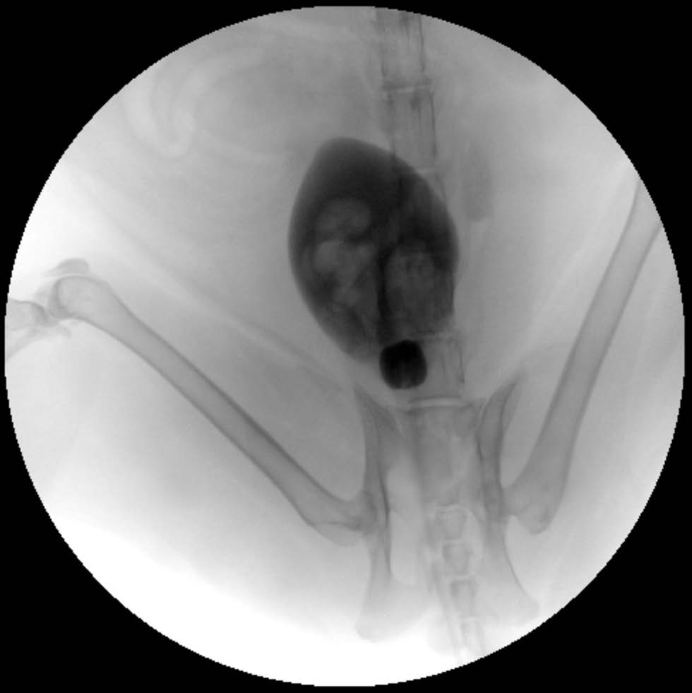 起初血尿好转,随后明显加重,遂再次评估。体检见外阴周围被毛血迹明显,胸骨旁2级收缩期心杂音。超声示膀胱腔内多个高回声圆结构,似与壁粘连。凝血酶原时间正常(19 s [15–22])。新发贫血(红细胞压积27% [30–52]),无再生表现(网织红细胞16 K/µl [3–50])。