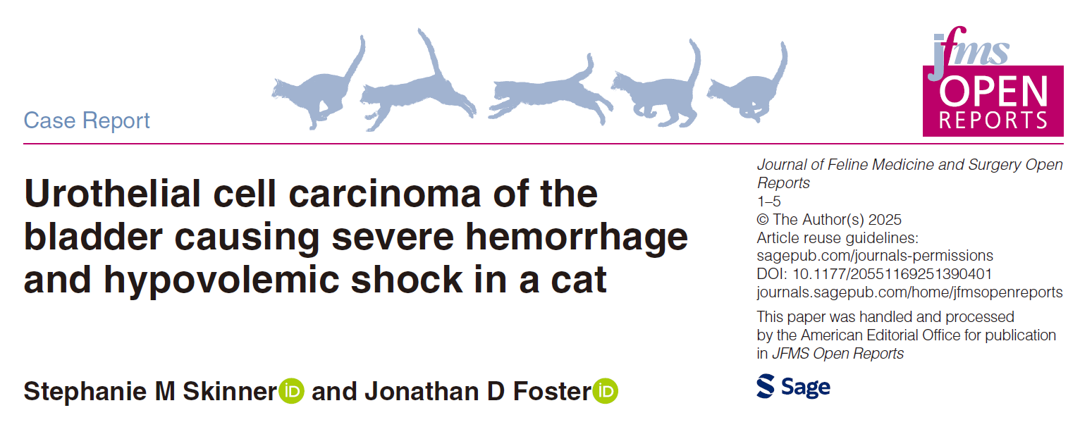 文献来源:Skinner SM, Foster JD. Urothelial cell carcinoma of the bladder causing severe hemorrhage and hypovolemic shock in a cat. JFMS Open Rep. 2025 Oct 15;11(2):20551169251390401.