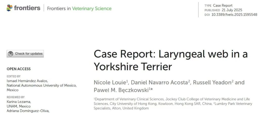 文献来源:Louie N, Acosta DN, Yeadon R, Bęczkowski PM. Case Report: Laryngeal web in a Yorkshire Terrier. Front Vet Sci. 2025 Jul 21;12:1595548.