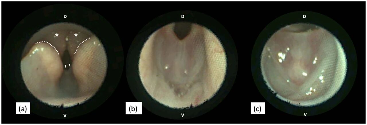 ↑ 喉部内窥镜影像显示先天性喉蹼畸形。(a)头侧视图中,喉蹼(三角形)位于楔状突(虚线)尾侧,与杓状软骨的角状突(星号)对齐。(bc)呼气(b)与吸气(c)状态下喉蹼的局部放大图。吸气时,随着喉部外展,膜性喉蹼的游离缘被拉伸(c)。D:背侧。V:腹侧。