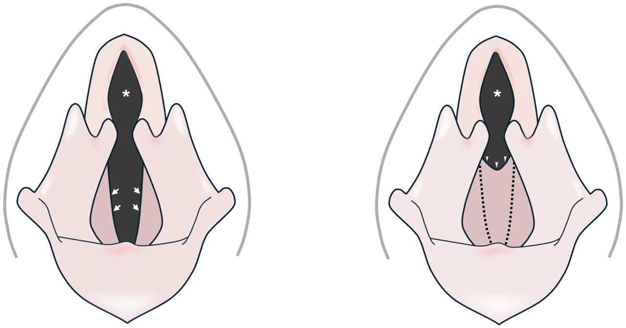 ↑ 正常犬喉部示意图(左)与先天性喉蹼犬喉部示意图(右)。正常犬喉部声门裂的腹外侧边缘由声带自由缘(箭头)界定。先天性喉蹼(三角形)取代了声带正常的游离缘(虚线),导致声门裂狭窄(星号)。
