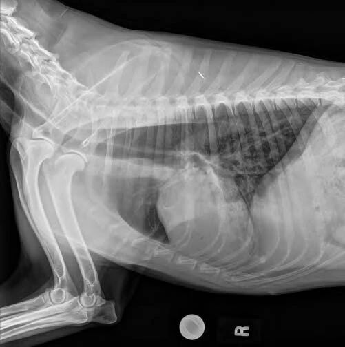 –可能会看到气管偏移(侧面视图的腹侧偏移和腹背侧视图的侧面偏移)。