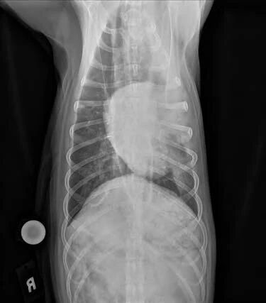 图2. 腹背侧胸部X光显示食管扩张和吸入性肺炎。