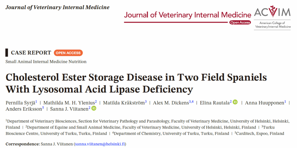 文献来源:Syrjä P, Ylenius MMH, Kråkström M, Dickens AM, Rautala E, Huupponen A, Eriksson A, Viitanen SJ. Cholesterol Ester Storage Disease in Two Field Spaniels With Lysosomal Acid Lipase Deficiency. J Vet Intern Med. 2025 Sep-Oct;39(5):e70223.