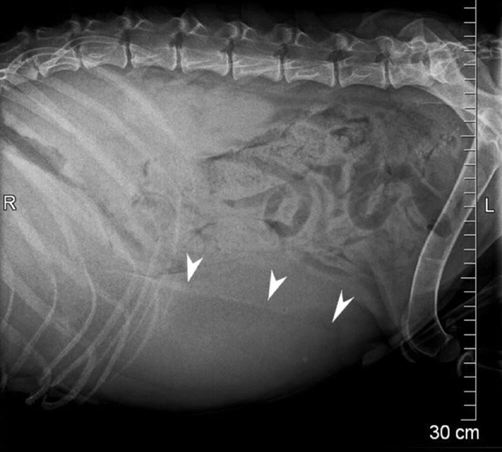 ↑ 侧面X光影像,可见明显的肝肿大(肝脏轮廓用箭头标出)。