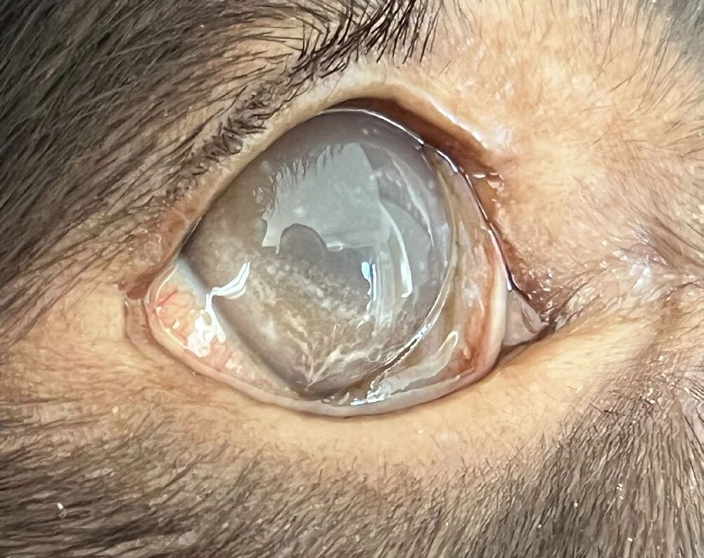 在6个月大时因角膜脂质沉积(下图)和上巩膜炎就诊。大约1年后,发现其体重下降和腹部膨胀。