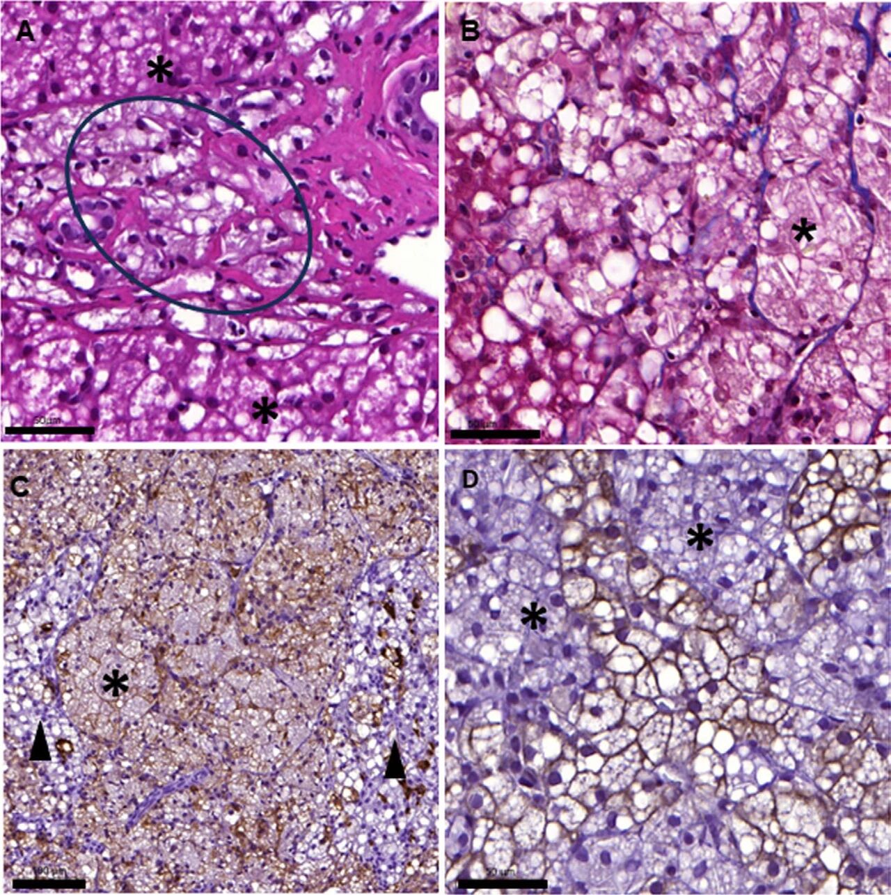 ↑ (A-D) 病例1和病例2的肝活检样本中获得的组织病理学图像。(A) 病例2肝细胞中度脂肪变性(*),含脂肪的巨噬细胞的间质和小叶巢(圈)。(B) 病例1脂肪和胆固醇充填巨噬细胞的浸润(*),辅以细纤维胶原(蓝色)。左下角有一小块残余肝实质,显示脂肪变性。(C) 病例1巨噬细胞浸润广泛。Iba-1阳性的结节性、扩张性灶内,富含泡沫细胞质的巨噬细胞(*)可见于分隔的肝索之间(箭头),单个库普弗细胞阳性染色。(D) 病例2肝细胞为细胞角蛋白阳性,位于巨噬细胞巢之间(*)。
