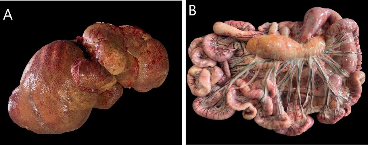 ↑ (AB) 病例2的尸检图像,显示出明显肝肿大(A)和肠系膜淋巴结肿大(B)。