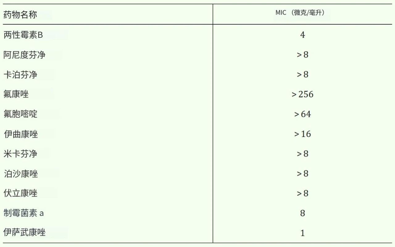 首诊后4年(2023年3月),出现了眼部分泌物、瞳孔散大和右下眼睑肿胀。其他方面健康,没有胃肠道疾病的迹象。观察到视网膜部分脱离,并伴有视网膜下细胞浸润,提示原壁菌病复发。接受了特比萘芬(10 mg/kg,PO,每日两次)的治疗,而伊曲康唑减少为每日一次。结肠样本检测出原壁菌,为对所有测试的抗真菌药物耐药(下表)。