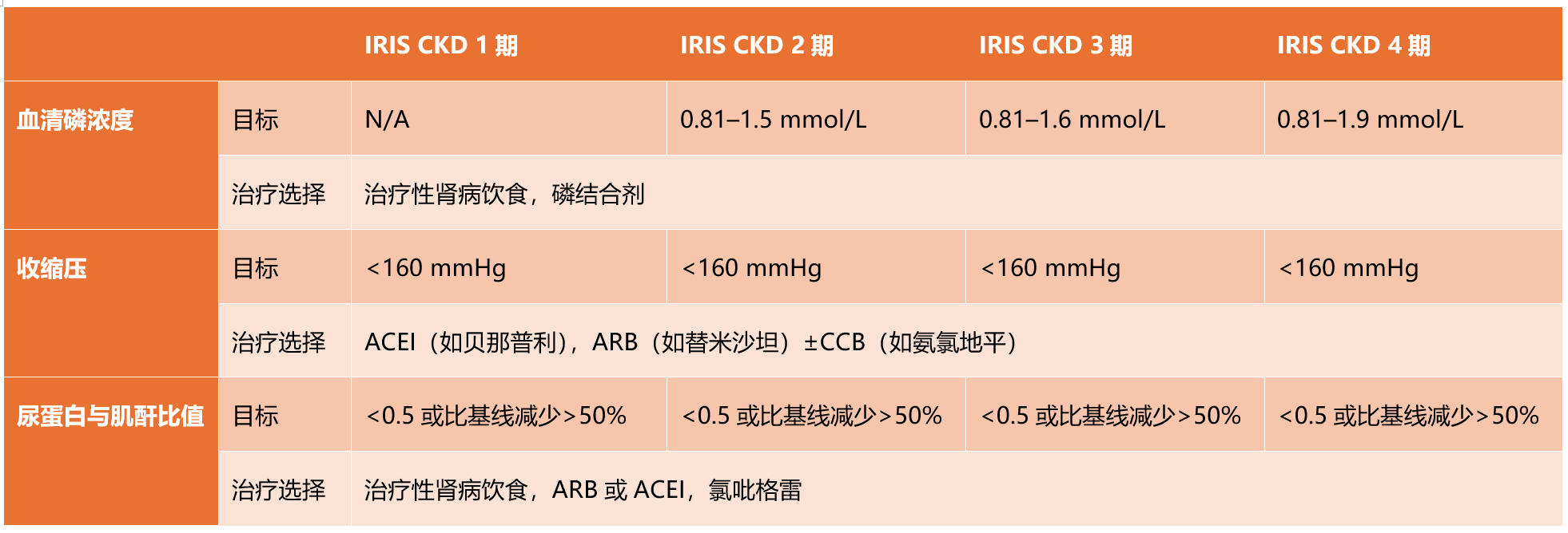 CKD是一种进展性疾病,目前尚无治疗方法能够逆转肾功能的下降。CKD的管理目标因IRIS分期(表3)而异,包括避免使用肾毒性药物、维持血清磷浓度在目标范围内、治疗蛋白尿以及管理CKD的后果,如恶心和贫血。