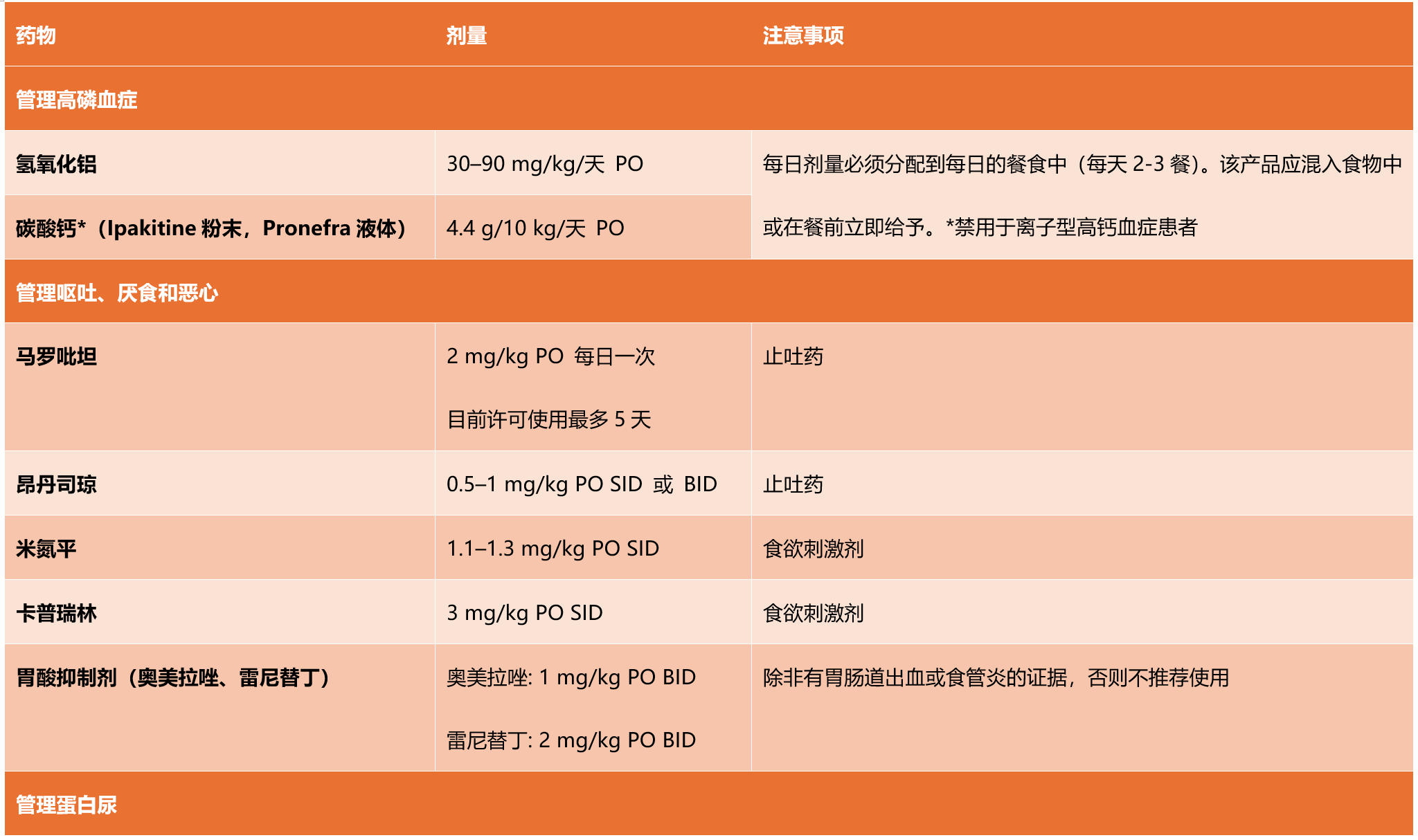 磷结合剂在胃肠道内结合磷,抑制其吸收,重要的是要向主人解释,结合剂必须与每餐一起服用才能有效。铝基磷结合剂通常耐受性良好且安全,但口感不佳。