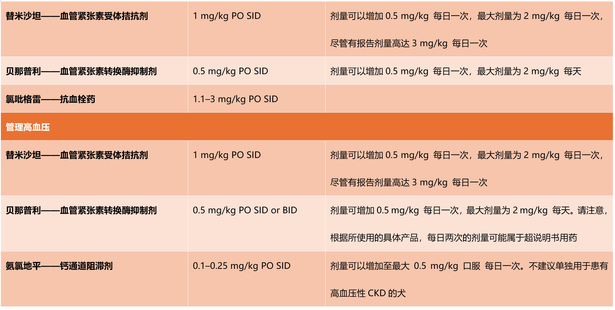 RAAS抑制剂是较弱的抗高血压药物,但由于其抗蛋白尿作用,通常建议作为患有高血压和CKD犬的首选药物。在严重高血压的犬(SBP至少为200 mmHg)中,RAAS抑制剂可以与钙通道阻滞剂(CCB,如氨氯地平)联合使用。