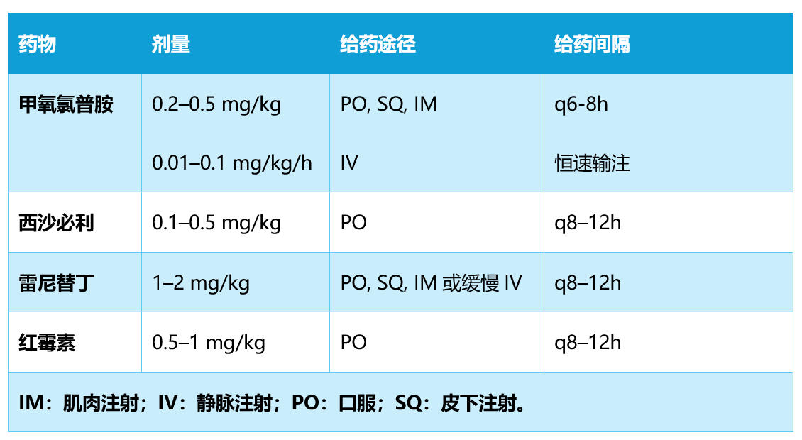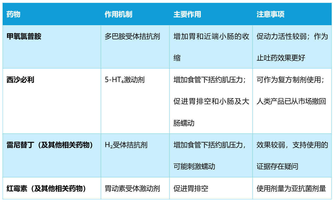- 增加胃肠道动力的药物可能有不同的作用机制和主要作用部位(表1、表2)。这些药物不应在机械性梗阻的情况下使用,且大多数在胃肠道出血的情况下是禁忌的。