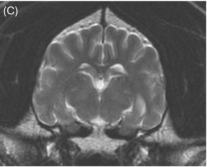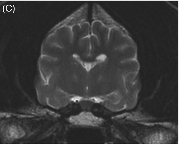 图4.(C)铜螯合治疗开始7个月后,丘脑核的T2高信号明显改善。